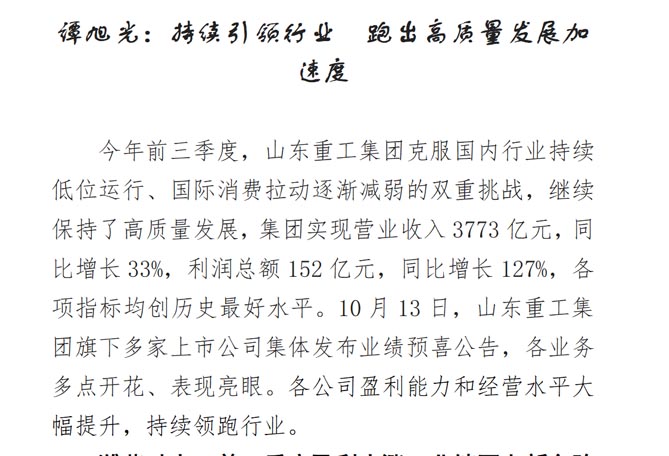 今年前三季度,山东重工集团克服国内行业持续低位运行、国际消费拉动逐渐减弱的双重挑战,继续保持了高质量发展,集团实现营业收入3773亿元,同比增长33%,利润总额152亿元,同比增长127%,各项指标均创历史最好水平。10月13日,山东重工集团旗下多家上市公司集