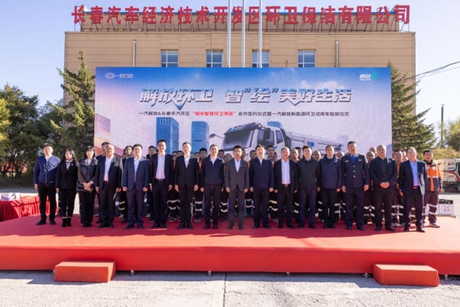 为助力吉林省公共领域电动化转型,10月19日,以“解放环卫 智‘绘’美好生活”为主题的一汽解放&长春市汽开区“城市智慧环卫项目”合作签约仪式暨一汽解放新能源环卫试用车投放仪式在长春市隆重举行。长春市城市管理局副局长张鑫彧、长春市工信局汽车处副处长张春龙
