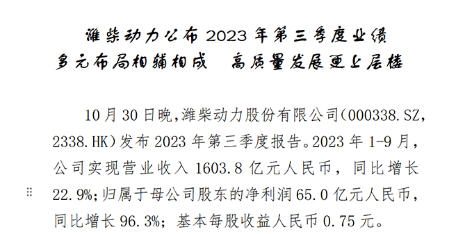 潍柴动力公布2023年第三季度业绩 多元布局相辅相成 高质量发展更上层楼