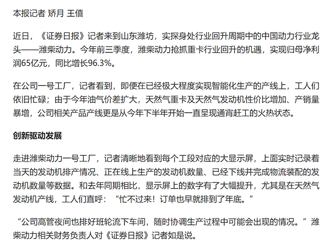 本报记者 矫月 王僖近日,《证券日报》记者来到山东潍坊,实探身处行业回升周期中的中国动力行业龙头——潍柴动力。今年前三季度,潍柴动力抢抓重卡行业回升的机遇,实现归母净利润65亿元,同比增长96.3%。在公司一号工厂,记者看到,即便在已经极大程度实现智能化生产的