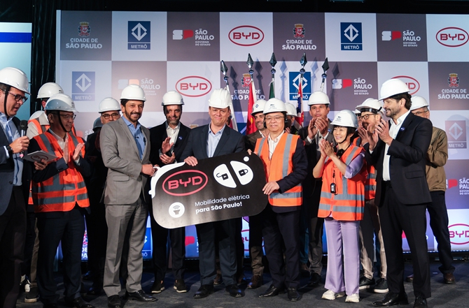 当地时间2025年10月8日,比亚迪董事长兼总裁王传福在巴西圣保罗现场考察了正在进行测试的地铁17号黄金线比亚迪云轨项目,并在同日向圣保罗市市长Ricardo Nunes正式交付首台22米长、搭载比亚迪刀片电池的纯电动铰接式大巴。圣保罗州州长Tarcísio