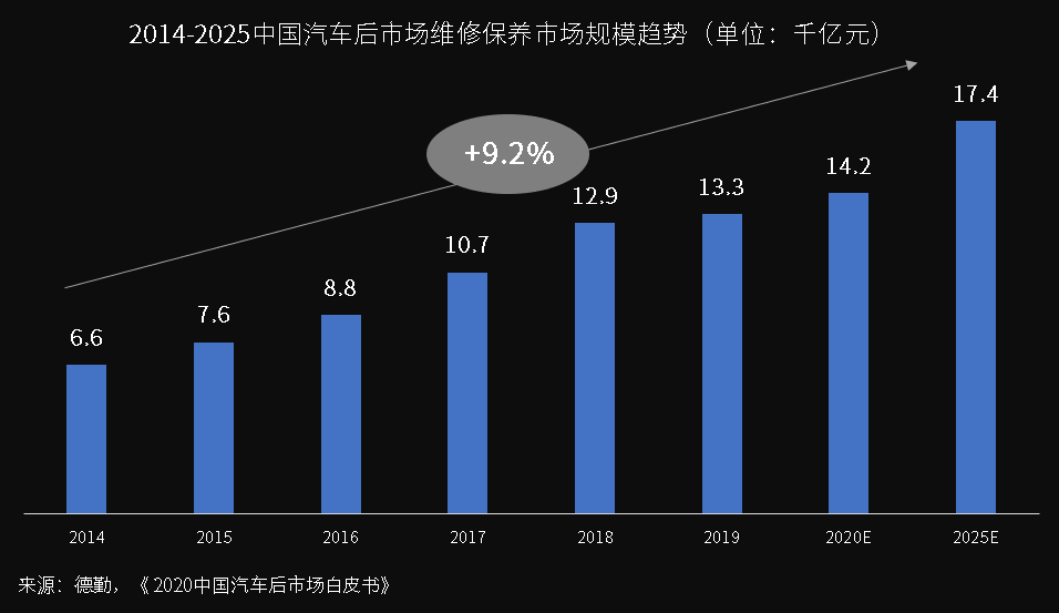 德勤于11月25日发布的《2020中国汽车后市场白皮书》数据显示:2019年我国汽车维修保养市场空间达到1.33万亿元,预计2020年规模达到1.42万亿元,并将保持9.2%的年度复合增长率。