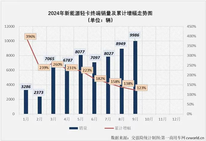 2024年以来,纯电轻卡销量“一骑绝尘”,以高歌猛进之势,领跑领涨新能源商用车市场。据第一商用车网数据显示,2024年1-9月,新能源轻卡累计实销6.16万辆,同比累计增长123%,其爆发态势,一方面源于部分城市燃油轻卡限行政策缩紧,另一方面则基于城配、跨城运