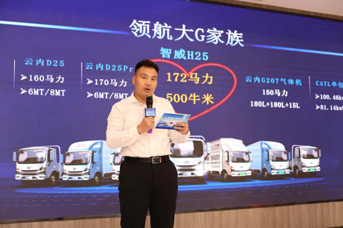 举一纲而万目张,解一卷而众篇明。安徽全柴股份有限公司营销公司品牌总监刘燕上台对智威动力进行深度解读。她表示,智威动力H25在动力性、可靠性以及经济性、使用寿命等方面均居行业领先地位。她坚信,经过近千个日夜精心打造的领航大G智威动力H25产品,必将树立4.2轻卡市场的全新标杆。展望未来,时代领航将继续创造更优质的产品,为用户提供更出色的解决方案。