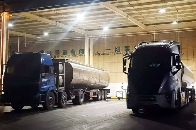 夜晚21:30,星空满天,曾超师傅进场,首先,车辆在工厂大门口处执行对全车的消毒杀菌,之后等待安检人员,对黄河重卡中的奶源抽样检查,合格后方可卸奶。卸奶的全程需要3小时,由于所有的操作都是其他工人协助,因此,期间,曾超可以美美的躺在“黄河宾馆”内小憩一会儿。