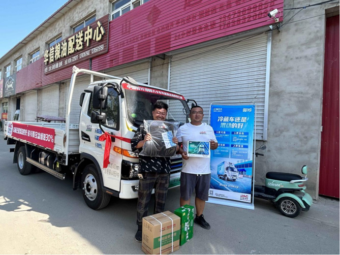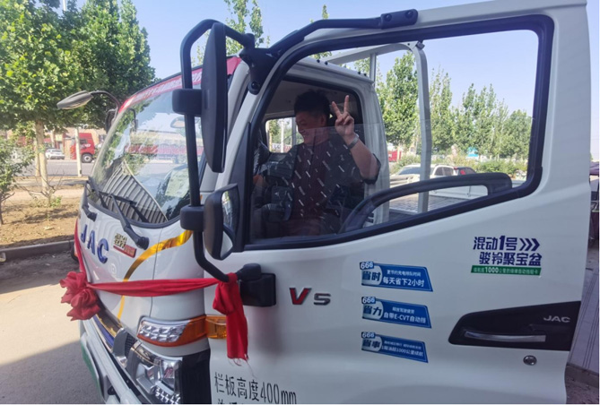 然而韩老板对骏铃的喜爱并没有停留在这两辆骏铃上。2022年7月,韩老板感觉3米7的货厢又有点不够用了,因为客户越来越多,订货的量也越来越大,他需要一辆4米2的、动力更强的轻卡。这一次,他还是毫不犹豫地选择了骏铃,提了一辆骏铃聚宝盆混动栏板车型。他说:“我们基本都在市里送货,骏铃聚宝盆是混动的,省油,而且还是自动挡,好开。骏铃的漆面非常好,前两辆车开久了颜色还是那么鲜艳,这辆骏铃聚宝盆的漆面也非常漂亮。骏铃聚宝盆能上绿牌,往市区里面送货不限行,开出去有面子,是我的移动名片。”