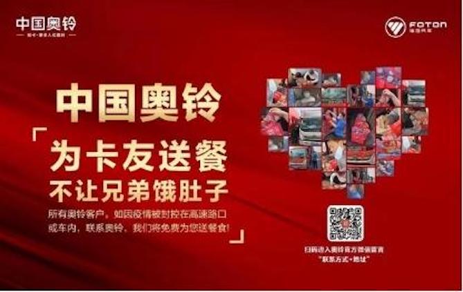 最近,各地疫情频发,奥铃践行企业社会责任,多次捐助物资、提供车辆保障。3月28日,中国奥铃山东聊城经销商组织运送生活防疫物品前往各地村委会;4月2日,海南政府调拨物资紧急驰援上海,中国奥铃为顺丰运送车队提供车辆护卫及全程免费车辆服务保障。此外,中国奥铃还发起了“以爱战疫”行动倡议书,向因疫情被封控在高速路口或车内的奥铃卡友免费送出数百份“爱心餐”,并呼吁各界社会优秀力量关注卡友,帮助卡友,同心抗疫,打通物流运输阻力,助力疫情防控地区物资保障。