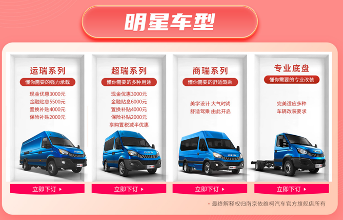 在去南京依维柯4S店购买车辆的同时,广大用户还可以登录天猫商城南京依维柯汽车官方旗舰店,参加“依起热爱 618全民狂欢”活动,凡在6月1日-6月30日期间,线上下订依维柯欧胜M1-30、V35-30、M1-33S、V42-33S等指定车型的用户,即可尊享高达万元的购车豪礼,可以说,只有你想不到的优惠,没有你享不到的福利!如此超值的购车权益,只为实实在在的让利车友,为依维柯用户创造更多价值。