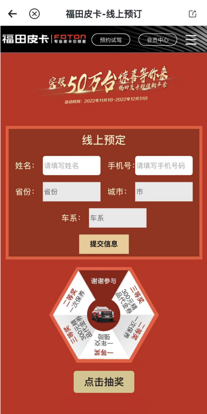福田皮卡突破50万台超值购车季,超多重磅福利大回馈,即日起在线订车即可享受惊喜好礼,下载APP即刻体验吧!