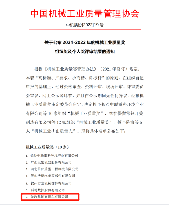 近日,在中国机械工业质量管理协会发布《2021-2022年度机械工业质量奖组织奖及个人奖评审结果》中,陕汽商用车荣膺2021-2022年度“全国机械工业质量奖”。