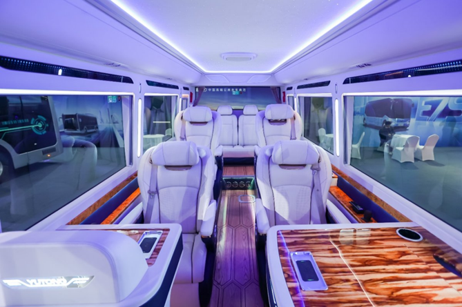 在人性化和智能化方面,T7星辰版还配备原厂豪华航空座椅,搭配龙血檀木木纹桌面,配以抽纸盒、高级水杯支架、无线充电位,配备50升大容积冰箱、高档酒柜、32寸高清投屏电视、车载Wi-Fi、集成式空气净化器等一系列公商务高端办公需求设备,打造极致享受与品位。