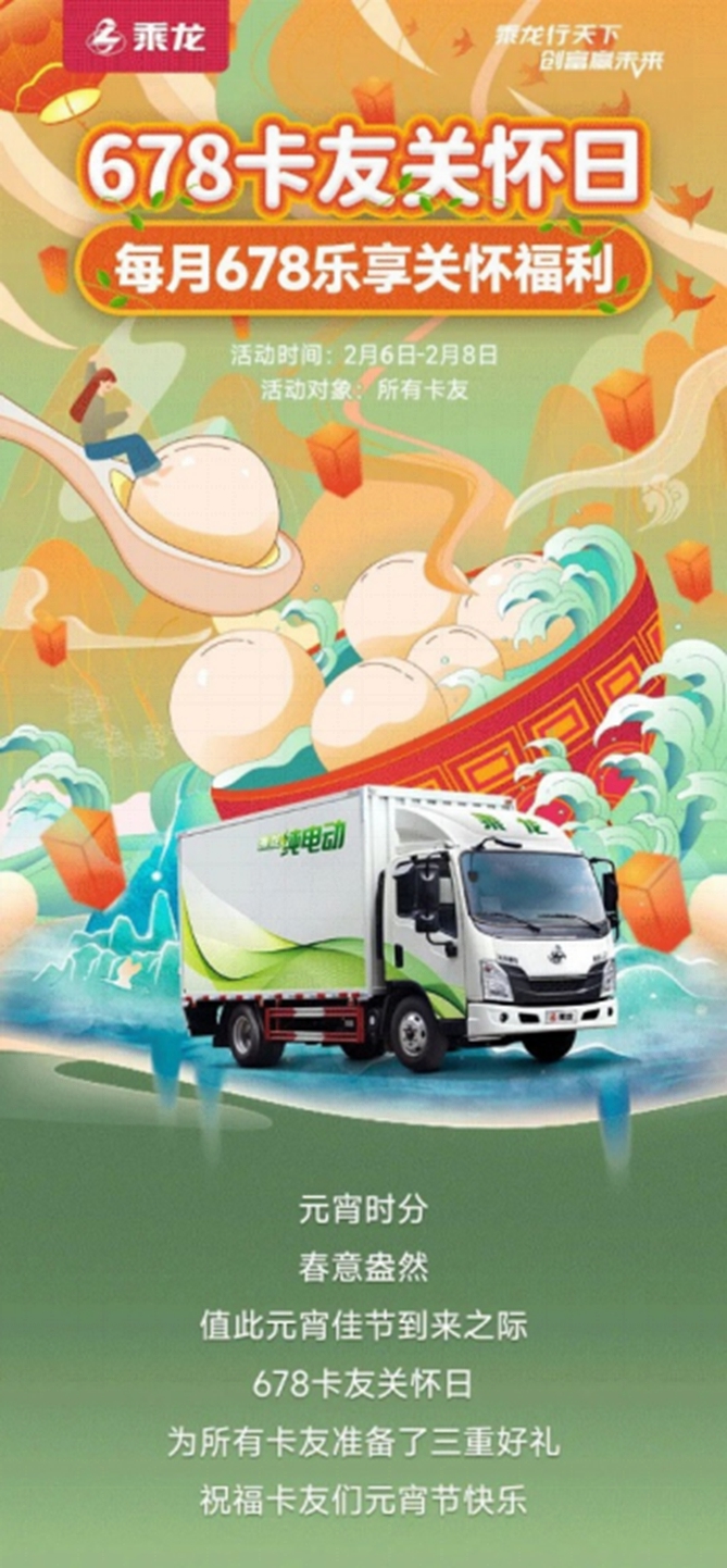 2022年11月,“67卡友日”再度升级为“乘龙卡友关怀日”,活动时间也从过去的每月6、7日两天,增加了一天,即每月6、7、8日,关怀的对象也不再限定乘龙的客户,而是所有卡友。关怀内容也不断丰富,包含了关怀礼、保养礼、好友礼、定制礼、惠享礼5大政策。新的“乘龙卡友关怀日”,进一步将乘龙的温度与关爱传递给更多的卡友。