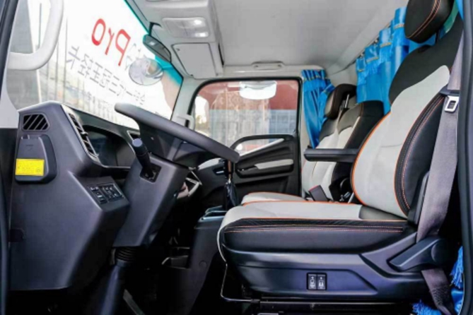 首先是驾舱舒适性的提升。在座椅设计上,福田奥铃Pro从用户实际用车场景出发,将重卡的气囊矫正座椅移植到轻卡上,并参考乘用车的人体工程力学设计,舒适性断面紧密贴合驾驶人后背,整体包裹性更强,腰部支撑更有力,在一定程度上能够缓解驾驶疲劳。同时,针对长短途运输场景,考虑到驾驶员临时休息问题,特别设计了可以放平的座椅,有效增加了用户的休息空间和舒适度。