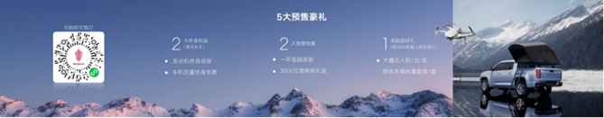 参与预售的用户还可以享受5大的预售豪礼,包括两大终身权益:大道皮卡的首任车主,发动机终身质保、车机流量终身免费;两大预售惊喜:一年金融免息、3000元增换购礼金;前三千名线上预定用户再享超级好礼:与大道皮卡互联的大疆无人机1台或价值5000元的联名车载帐篷套装1套。