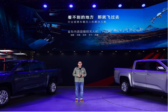 大道行业首搭智能IVI交互生态,包含12寸角度可调向日葵屏,探索未知的皮卡路书,10个高品质音响的车载KTV系统,以及家人语音等智能配置。值得一提的是,大道皮卡实现行业首次车载无人机与车机生态融合,可以在车内轻松实现无人机的语音控制,从而实现无人机探路、伴飞、拍照、回传等多场景用途。