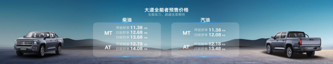全能者包含手自动、两四驱多款车型,其中,柴油版5款车型,预售价格11.38万到14.08万!汽油版4款车型,预售价格11.38万到13.48万!