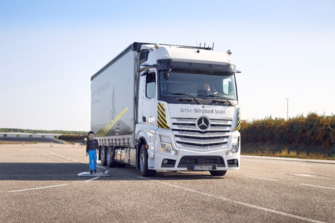 2020年,奔驰卡车推出具有行人监测功能的第五代主动制动辅助系统(ABA 5),并在车侧区域保护辅助系统(SA)基础上,推出可以启动自动制动的主动式车侧区域保护辅助系统(ASGA);