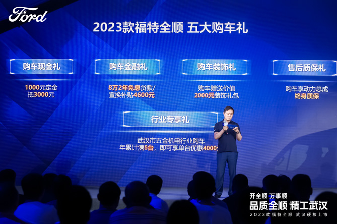 在发布会的结尾,在体验完2023款福特全顺所带来的一段奇妙旅程后,湖北威汉集团执行长李舒洲在万众期待中公布了这款新车针对行业用户的五大购车福利,包括购车现金礼一一1000元定金抵3000元、购车金融礼一一8万2年免息贷款/置换补贴4600元、购车装饰礼一一购车赠送价值2000元装饰礼、售后质保礼一一购车享动力总成终身质保以及行业专享礼一一武汉市五金机电行业购车年累计满5台,即可享单台优惠4000元。