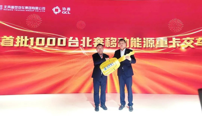 今年4月北奔重汽与协鑫集团达成战略合作协议后,双方围绕自治区“新能源项目”,积极推动包头市新能源项目指标落地,并于5月24日下午,在SNEC第十六届(2023)国际太阳能光伏与智慧能源(上海)大会暨展览会现场举行了协鑫首批1000台北奔移动能源重卡交车仪式。