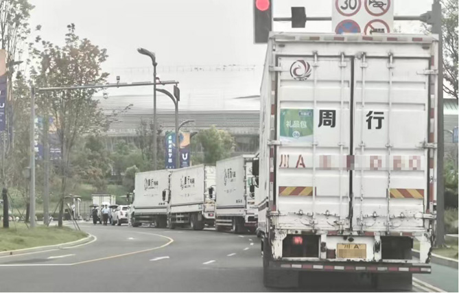 赛会期间,人们常常看到由30台白色乘龙卡车组成的物资运输车队穿梭于成都街头,成为大运会另一道亮丽的风景线。