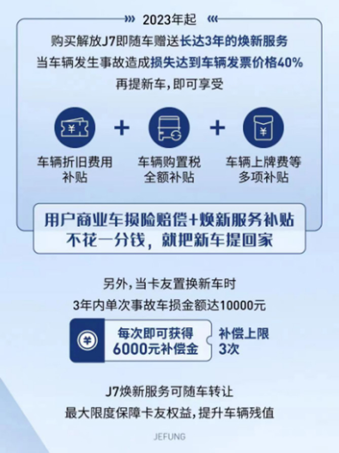 一方面,一汽解放以硬核实力持续产品升级;另一方面,以感动服务持续为卡友运营保驾护航!自2020年起,一汽解放便为每辆J7车免费赠送了一份长达3年的专属“焕新”服务,目的就是保障J7用户在遇到车损交通事故情况下,能将损失降到最低。三年来,这项政策帮助众多卡友在交通事故之后“不花一分钱,新车提回家”,让卡友重燃生活的勇气,做卡车司机最坚实的后盾。
