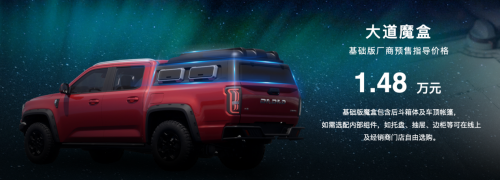 大家都知道皮卡的空间拥有多功能性和多用途性的特点,利用好空间将会提升用车体验。敢探者将首发搭载量产版的“大道魔盒”,厂商预售指导价基础版为1.48万,为越野生活增添了更多可能性。