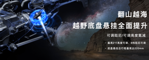 最后,敢探者的高越野性,能够带我们翻山越岭,得益于越野底盘悬挂的全面提升,其总行程最高达220mm,接近角32°,离去角27°,离地间隙255mm,通过一些倾角较大的交叉轴,可以做到不拖底。而且高配版本还有可变阻尼/高度八段氮气减震,我们便可以轻松应对各种障碍。