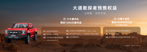 订购大道敢探者的用户权益分为:意向礼和大定礼两种。其中,线上缴纳1000元意向金的用户,可享受六大意向礼,包括首任车主发动机终身质保、首任车主变速箱终身质保、首任车主车机系统流量终身免费、质保期内免费道路救援、购车首年内四次上门取车或送车服务及两年金融免息政策。