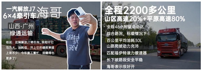 他说:“这辆解放J7牵引车搭载的560马力发动机,动力更强劲了,12挡AMT变速箱,比之前的手动挡开起来更舒服,效率自然就提上来了,以前需要三天才能送达的货物,现在两天就能到目的地。还有最重要的油耗问题,从山西到广州一趟2200多公里,有高速也有山路,百公里平均油耗30L,相当给力!目前这车已经跑17万公里了,一点毛病也没出过,机箱桥都是长换油、长保养,我一年保养一次就够用,特别省心!有了它,我赚的钱也多了,还能省出时间做自己喜欢的事,真的是特别满意。”