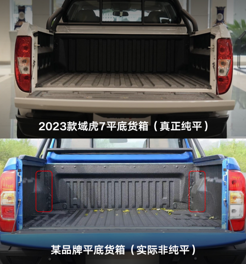 作为一款兼具商用与乘用功能的皮卡,强大的装载能力自然必不可少。2023款域虎7同步推出平底货箱车型,相较于行业上普遍存在的平底货箱车型,由于其无法避让燃油管道,通常采用预留鼓包的设计,既不美观,又会影响空间利用率。