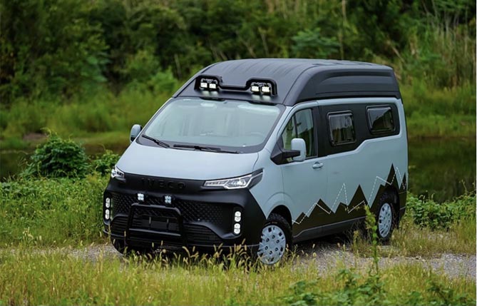 作为依维柯家族的全新产品,依维柯聚星系列以突破传统的未来科技设计语言,打造个性十足的“有维新青年”。聚星B型露营居旅车,以战舰灰与哑光黑为主基调,搭配断点纹路,酷炫至极。车头前牛栏杆与远光聚焦射灯搭配车顶泛光铺路灯的设计,像一只威严的野兽,使整车多了一份野性之美。
