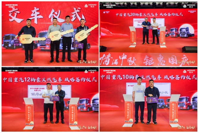 活动现场,中国重汽豪沃燃气车济宁区域集体交车仪式隆重举行。我们坚信,此次豪沃“节气王”的成功交付,必将助力当地卡友开创高效运营新局面,助力济宁区域物流运输高质量发展。