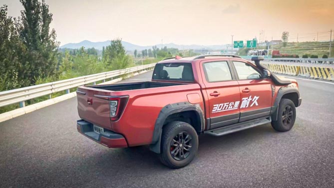 外观呈现立体、奔放的美式皮卡造型风格,前脸高度整合,格栅和大灯采用一体式设计,强化车头的视觉冲击力,整车行驶中远观犹如猛虎出山、蛟龙入海,凌厉霸道。