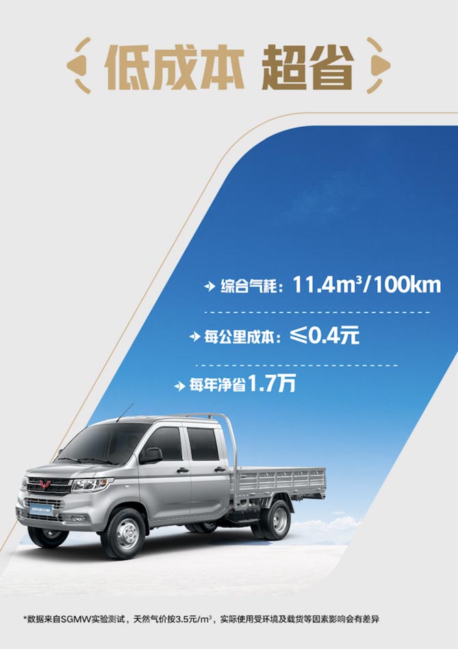 此次推出的荣光新卡双后轮CNG版,在继承五菱商用车品质基因的同时,结合用户需求和市场环境不断进阶,将节约成本落到实处,让创业之路更加简单,助力更多新时代奋斗者勇攀事业高峰,共创美好未来!