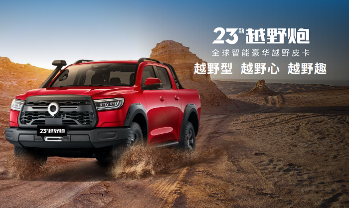 越野炮作为中国首款全地形量产越野大皮卡,广受越野玩家信赖,稳居中国越野皮卡单车型销量榜首。23款越野炮定位“全球智能豪华越野皮卡”,冠军实力再进阶,以“越野型、越野心、越野趣”三大硬核实力,成为越野爱好者的专业伙伴。