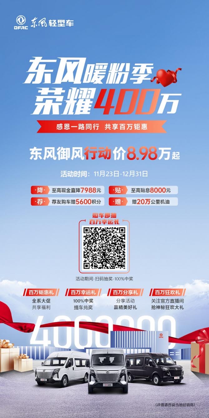11月23日至12月31日活动期间,东风御风亲情价8.98万元起,超值钜惠带回家,现在购东风御风更有机会享受至高7988元的现金优惠,以及至高8000元的贴息政策,购车即可获得20万公里保养机油的福利。