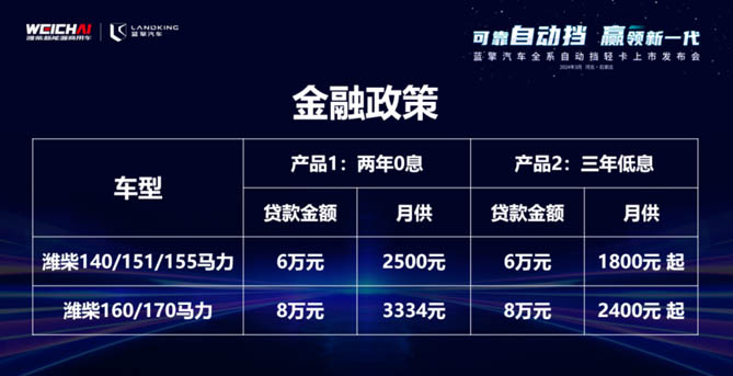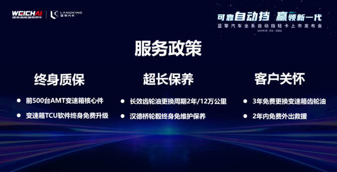 为减轻用户购买压力,新品提供两年0息/三年低息金融政策,最低月供仅1800元。与此同时,蓝擎汽车还为用户提供前500台AMT变速箱核心件终身质保、变速箱TCU软件终身免费升级、长效齿轮油更换周期2年/12万公里、汉德桥轮毂终身免维护保养、3年免费更换变速箱齿轮油、2年内免费外出救援等强大的服务保障。