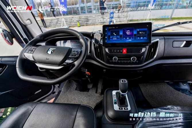 舒适性方面,蓝擎汽车自动挡产品每千公里可减少300~500次换挡离合操作,配合气囊减震座椅、多功能方向盘和自动驻车等配置和功能,大幅降低用户劳动强度。此外,全新模具驾驶室、全包驾驶室和加厚全包发动机隔音棉,让驾驶室成为静谧的工作生活区。