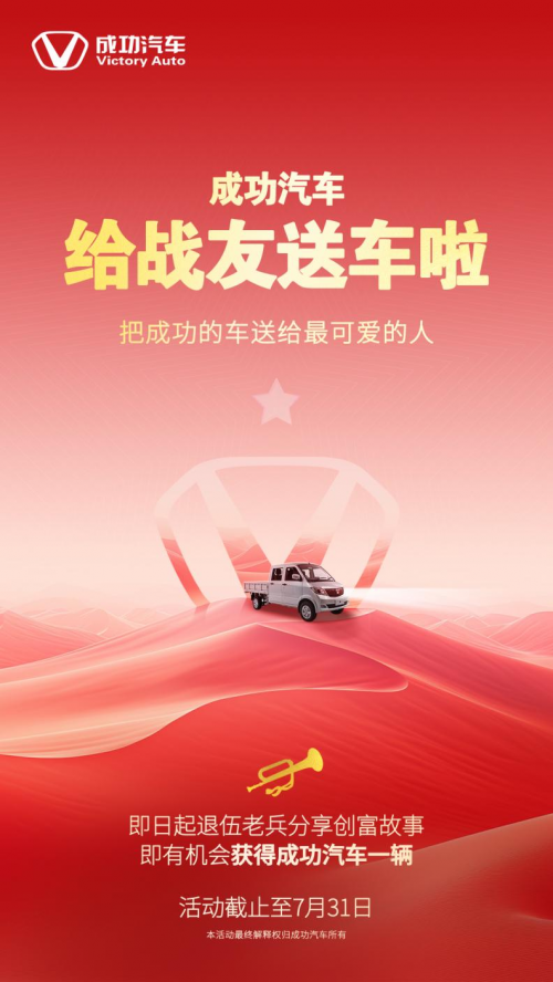 成功汽车此次携手人民日报旗下卡车司机官方公益服务平台“中汽兄弟”,推出“为退役军人创业开路”赠车活动,将再次为广大退伍老兵送上更大福利。即日起至7月31日,点赞、关注#成功汽车给退役军人送车#话题页置顶微博,并带话题发布退役之后工作、奋斗、创富,或退役后继续履行军人职责,为社会做贡献的故事,即有机会获得成功汽车一辆。发布内容形式不限,可以是文字、视频或者图集。本次话题活动将使用微博官方抽奖平台进行抽奖,并在7月31日统一开奖,送出4台成功汽车。