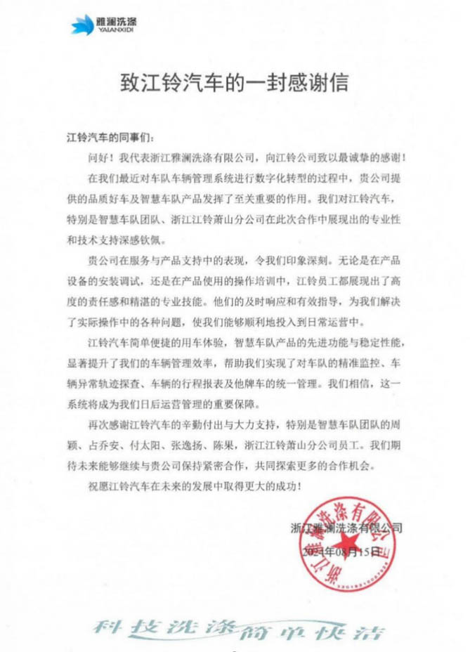 这封感谢信是肯定、是认可。客户的每一份满意都是我们前进的动力,江铃汽车将继续秉持创新驱动、品质之上的发展理念,不断优化和完善车辆性能及服务,为客户提供更广泛的选择和更贴心的服务。在未来的发展道路上,江铃汽车将与雅澜洗涤等众多合作伙伴携手共进,共同书写行业发展新辉煌。