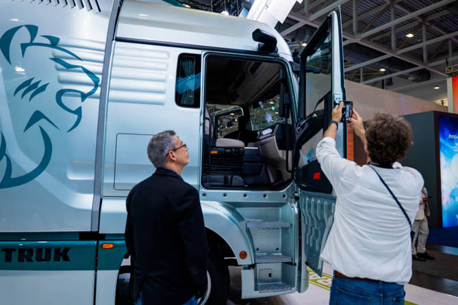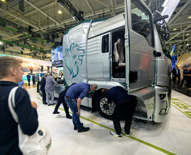 展会核心区域,中国重汽展台前人头攒动,不少参展商、媒体人和参观者纷纷围绕着本次中国重汽展出的汕德卡氢燃料牵引车参观讨论。对中国重汽在环保、科技方面的创新成果表示赞赏,并对未来绿色出行的前景充满期待。
