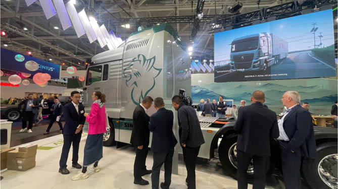 此次中国重汽展出的车型力作中,不乏全球商用车行业领先的亮点产品:全新升级的超低风阻黄河氢内燃机牵引列车、环保先锋HOWO统帅Pro纯电轻卡,以及重磅的汕德卡氢燃料电池牵引车。这些产品以其零碳排放、高效能的特性、前沿的科技驱动,展现了未来商用车绿色出行的无限可能,为物流运输行业树立了绿色标杆。这一系列产品在IAA上的璀璨亮相,不仅彰显了中国重汽在绿色、智能、高效转型道路上的坚定步伐,更向世界展示了一幅中国商用车行业迈向新辉煌的壮丽画卷。