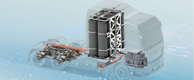 同时,该车还拥有多项节能技术,例如:多模式能量回收,通过负载估计实时调整控制策略,预测性智能节能模式等。搭载的燃料电池系统为中国重汽自主研发,额定功率300kW,功率质量比为820W/kg,使用寿命大于30000小时,低冷启动温度低至-40℃;燃料电池系统具备工况自适应、环境温度自适应和零部件可靠性自适应等参数自主学习和标定的控制能力。储氢系统使用 8 套 350 升、70MPa 的气瓶,总容量高达 2800 升,在多项节能措施和控制策略的加持下,整车百公里氢耗小于9.5kg,续航高达1200公里。