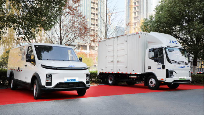 聚力发展新质生产力,江淮商用车依托“星链1号”技术品牌,油混电等多动力技术路线并举,推出覆盖轻卡、VAN车、智慧物流车、中重卡、专用车等全系列的新能源产品,累计交付数万辆,多次斩获行业客户批量采购,并出口海外多国。面向城配物流领域,江淮1卡已形成ES/EV/EK三大品系,江淮1van也陆续推出多款新能源物流车。会议现场,江淮新能源ES6轻卡和江淮1van Van宝路新能源物流车重磅亮相,为绿色物流发展按下“加速键”。