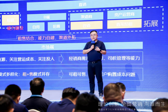 福田汽车集团副总裁、时代事业部总裁刘旭光在会上作了《实事求是 解放思想 向难而生》的主题报告,并谈到,2024年商用车市场规模趋稳,新能源、海外及专用车成为推动行业结构性增长的重要市场,新能源从南到北趋势明朗,经济型和低价车将成为常态,产品与商业模式不再孤立发展。这就要求我们要抛弃幻想,积极拥抱新模式才能在竞争中胜出。前市场和后市场之间要加强业务协同,建立新媒体运营能力来解决前端线索流量开源;后市场作为链接客户的核心生态,与客户粘性强且价值空间大,要向客户经营转型。同时,从建立网络准入和准出标准、重构价格管理体系、优化商务政策、优化管理指标等组合拳,实现内价值链优化。
