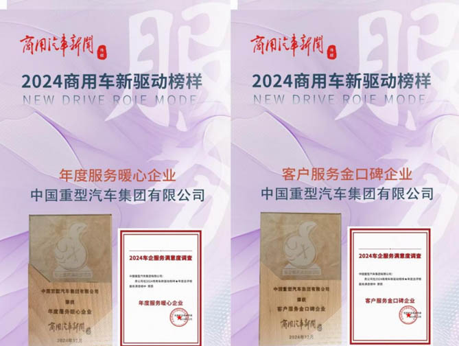 中国重汽始终坚持“客户满意是我们的宗旨”服务理念,在客户服务体验上力求完美,确保每一位客户都能享受到贴心、高效、专业的全方位服务。在2024年车企服务满意度调查中,中国重汽凭借细致完善的服务体系、高效专业的售后支持以及不断创新的服务模式,荣获“年度服务暖心企业”、“年度服务金口碑企业”两大荣誉,是对其坚持客户满意至上、不断提升用户体验的有力证明。