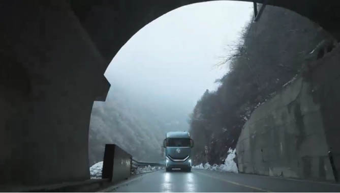 (翻山越岭:秦岭,华夏大地的脊梁,峰峦叠嶂,沟壑纵横,以雄浑壮阔之姿横亘天地间。欧曼银河动力澎湃,操控精准,制动可靠,在幽暗隧道与连续弯道和上下坡间轻盈穿梭,一路畅行!)