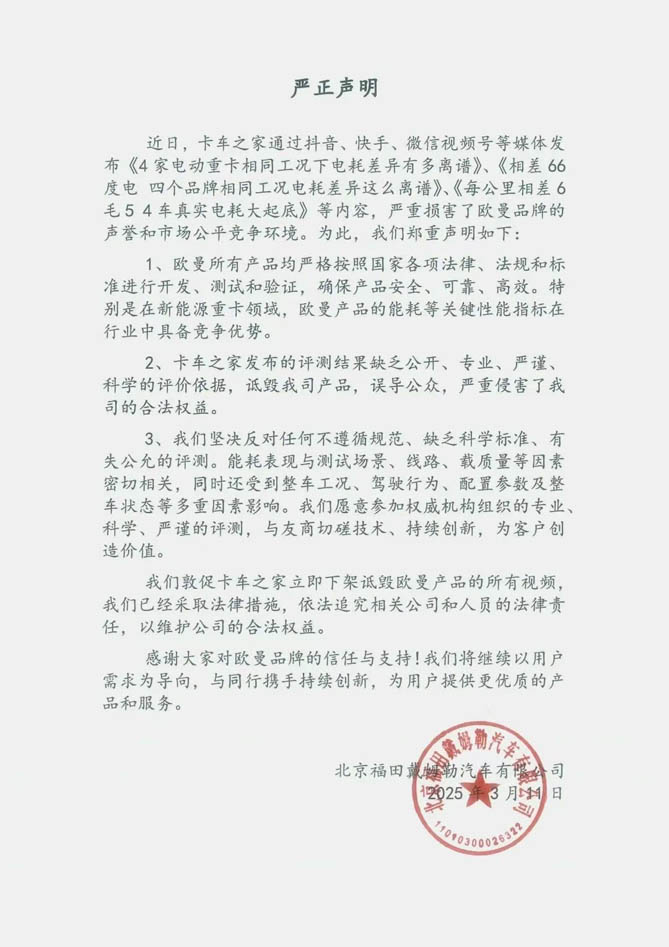 北京福田戴姆勒汽车有限公司对卡车之家发布的关于欧曼产品的部分内容进行严正声明。