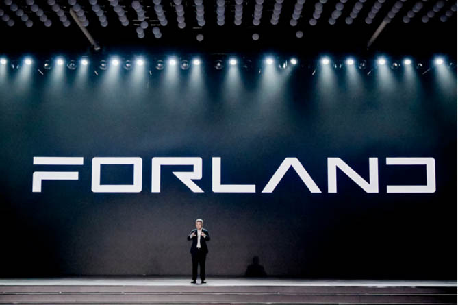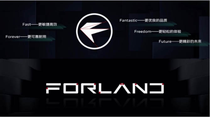 FORLAND字母标整体遵循轻量、现代、硬朗的设计风格,采用白银比(1:1.414)的字体比例,扁长形的字体给人以稳重可靠视觉感受,同时也传递更多科技感,字母笔画整体更加轻量现代,正负空间相得益彰,书写方式更加平直干练。“F”字母左侧做切割处理,拆分成汉字“一”和向上的箭头,寓意一路前进;字母“R”与“A”打开封闭的空间,一笔书写,更加简洁,寓意开放、效率与向上;字母“D”与“N”共用一竖,使整体视觉感受更加均衡、通透,凸显品牌的敏捷性与通达性。外圆内方的字体与标志图形方圆结合的风格保持一致,令整体视觉效果和谐统一,实现了自然美学与现代美学完美融合。同时,“Forland”首字母“F”呈现独特,由八条直线交织切割而成的雨燕型“F”,寓意通达四面八方,展现出时代汽车在全球化布局中的宏大视野与进取精神,也赋予了它更多价值,Fsat更敏捷高效,Forever更可靠耐用,Fantastic更优良的品质,Freedom更轻松的体验,以及Future更精彩的未来,这也是对每一位客户、每一个伙伴的承诺。