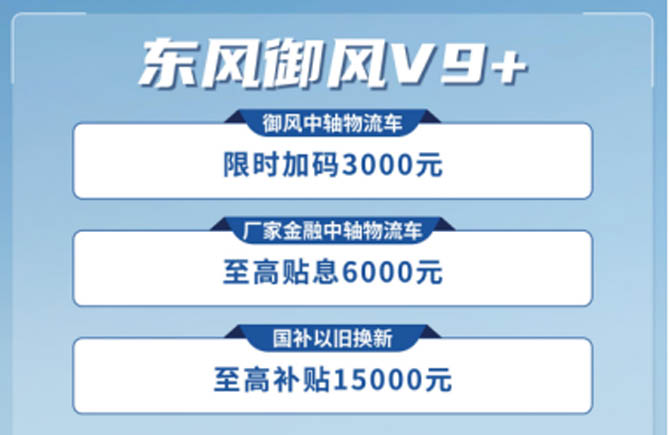 VAN车家族特别为每一位努力奋斗的用户,带来至强优惠政策!东风御风V9+中轴物流车限时加码3000元,更有金融及置换国补优惠。